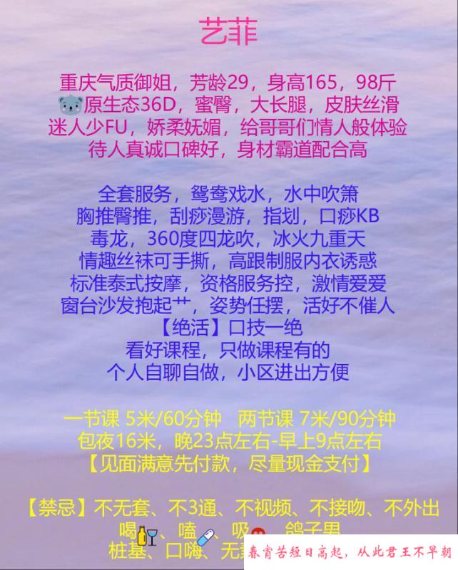 服务项目: 全套服务 鸳鸯戏水 水中吹箫 臀推胸推 刮痧漫游 指滑 口痧口暴 69毒龙 冰火九重天 泰式按摩 爱爱